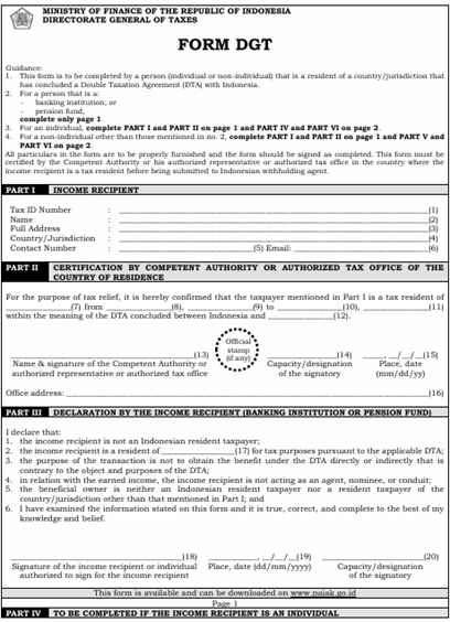 Sehubungan dengan telah diundangkannya Peraturan Menteri Keuangan Nomor 112 Tahun 2025 (PMK-112/2025), disampaikan bahwa penerapan Persetujuan Penghindaran Pajak Berganda (P3B) oleh Wajib Pajak Luar Negeri dilakukan dengan menggunakan format Formulir DGT sebagaimana diatur dalam PMK tersebut.